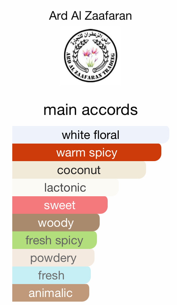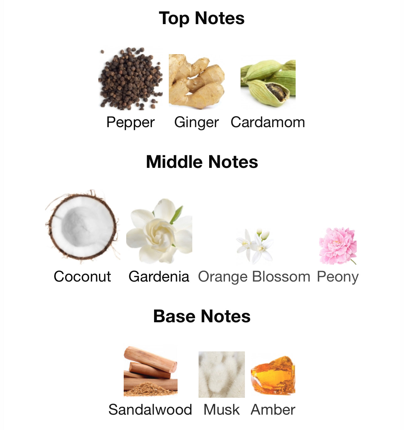 Top notes are Ginger, Cardamom, Coconut and Black Pepper