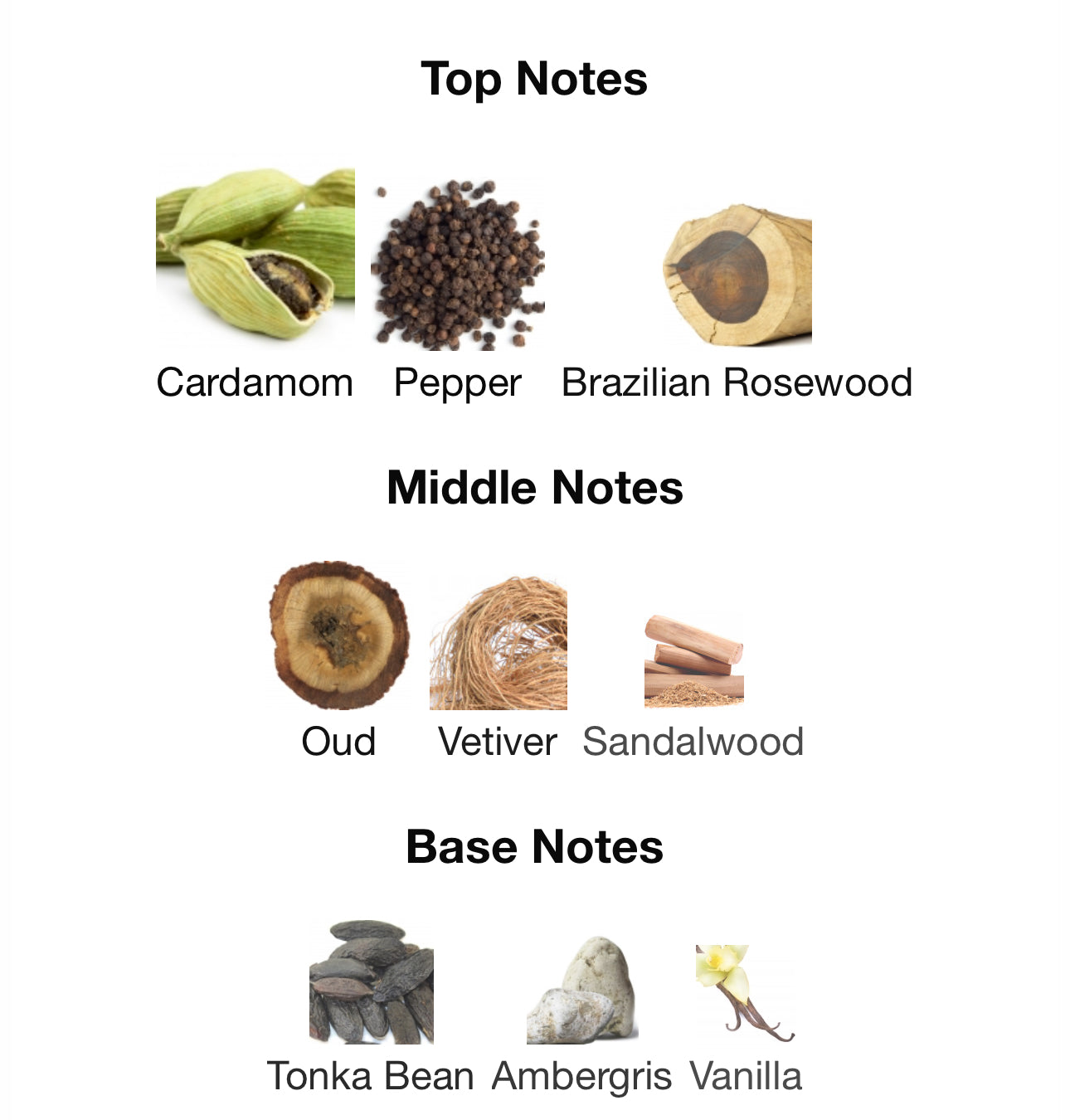 Top notes are Cardamom, Pepper and Brazilian Rosewood; middle notes are Oud, Vetiver and Sandalwood; base notes are Tonka Bean, Ambergris and Vanilla.