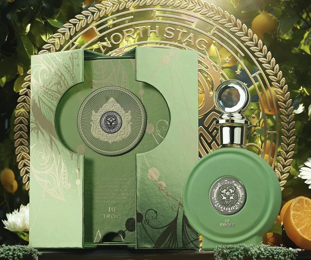 Inspired by Imagination Louis Vuitton! The North Stag Expressions III TROIS perfume is a sophisticated fragrance from Paris Corner Perfumes, designed for the modern man. It features a harmonious blend of citrus, spice, and woodsy notes. This perfume is presented as an embodiment of confident and refined masculinity. Inspired by Imagination Louis Vuitton.