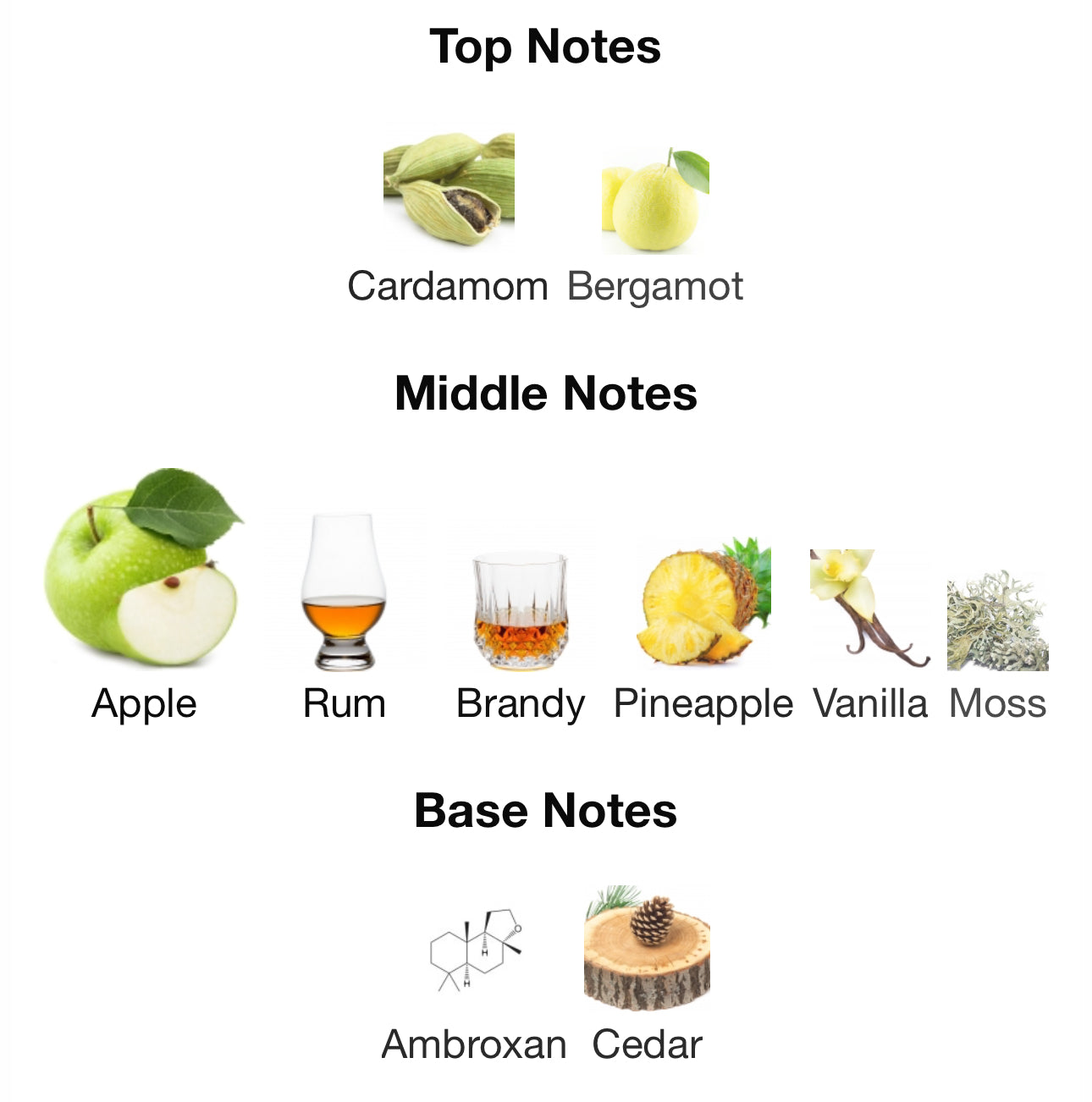 - Middle notes are Apple, Rum, Brandy, Pineapple,Vanilla and Moss