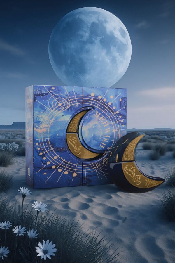 In its crescent silhouette lies a composition of contrasts: zesty bergamot draped in honey, orange blossom enriched with pistachio, and a smooth foundation of vanilla, amber, and tonka bean.
