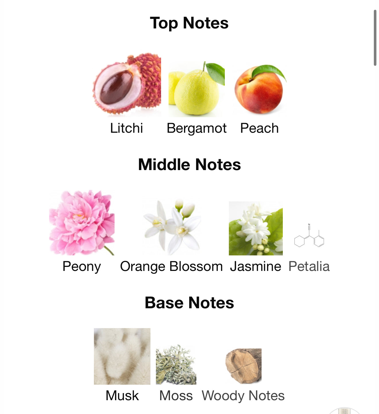 - Middle notes: Peony, Jasmine, Orange Blossom
